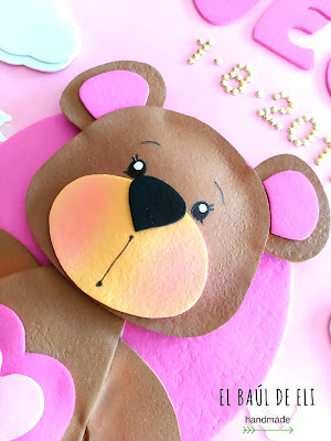 El cartel está realizado en goma eva y cartón. Los colores que he utilizado, sobre todo, son el blanco, el marrón, y el rosa en dos tonos. El cartón está en el interior de la estructura, que la refuerza y le da más rigidez.